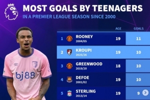 体育资讯4月13日讯 伯恩茅斯在本轮英超爆冷2-1击败阿森纳,小将克鲁皮取得进球。数据统计显示他有望打破鲁尼保持的一项新世纪英超单赛季U20进球纪录。