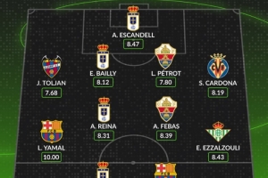 Whoscored评本轮西甲最佳阵:亚马尔满分领衔,费兰、拜利在列